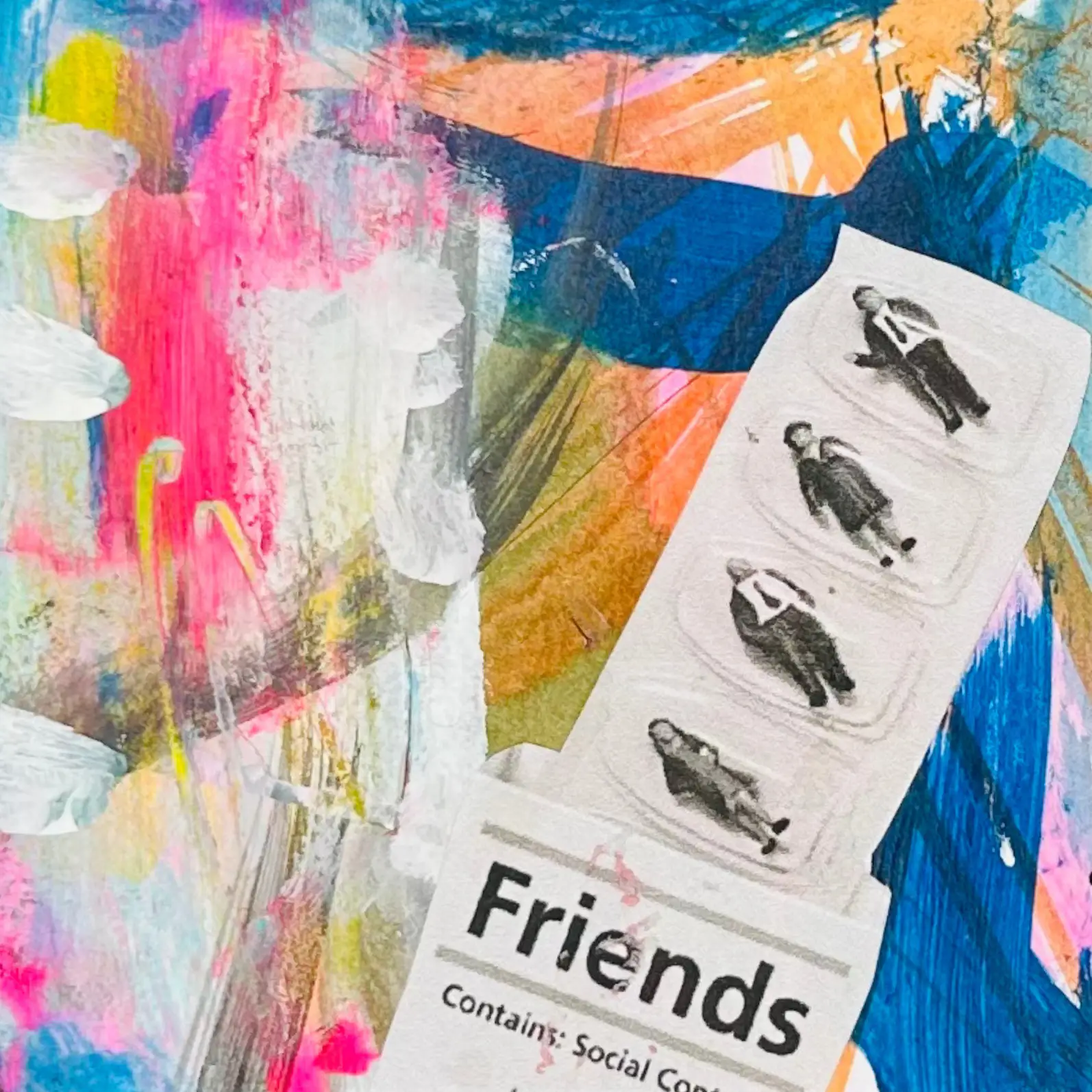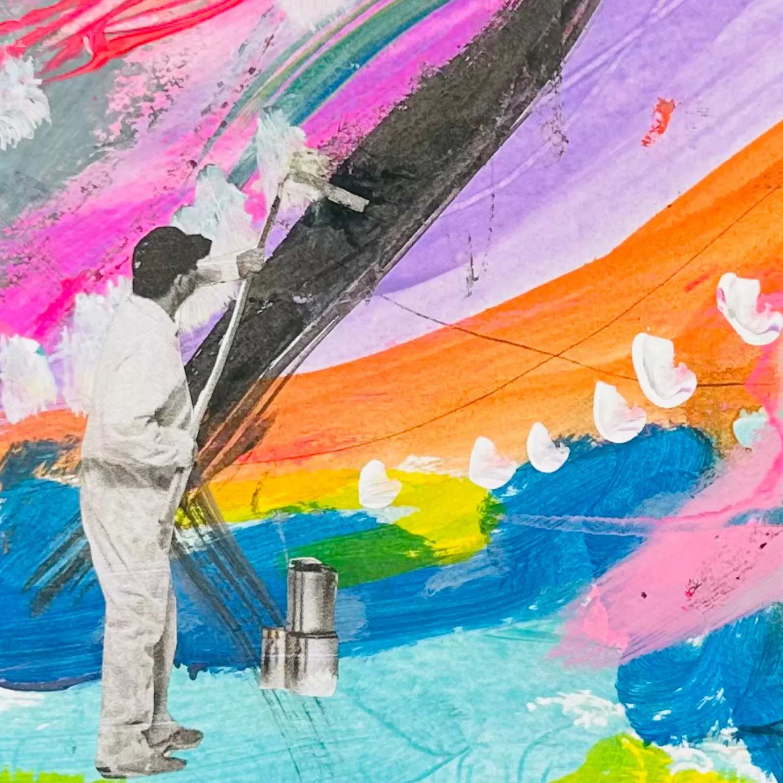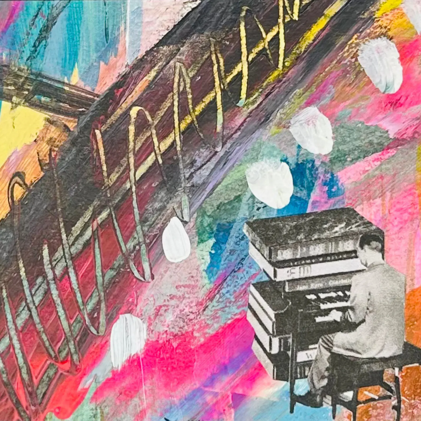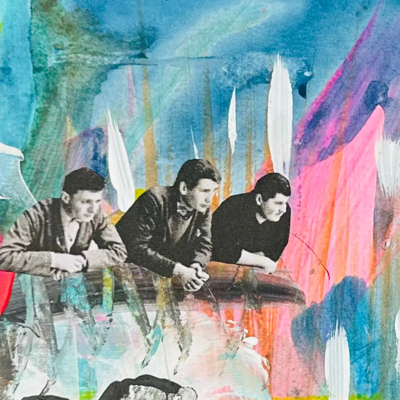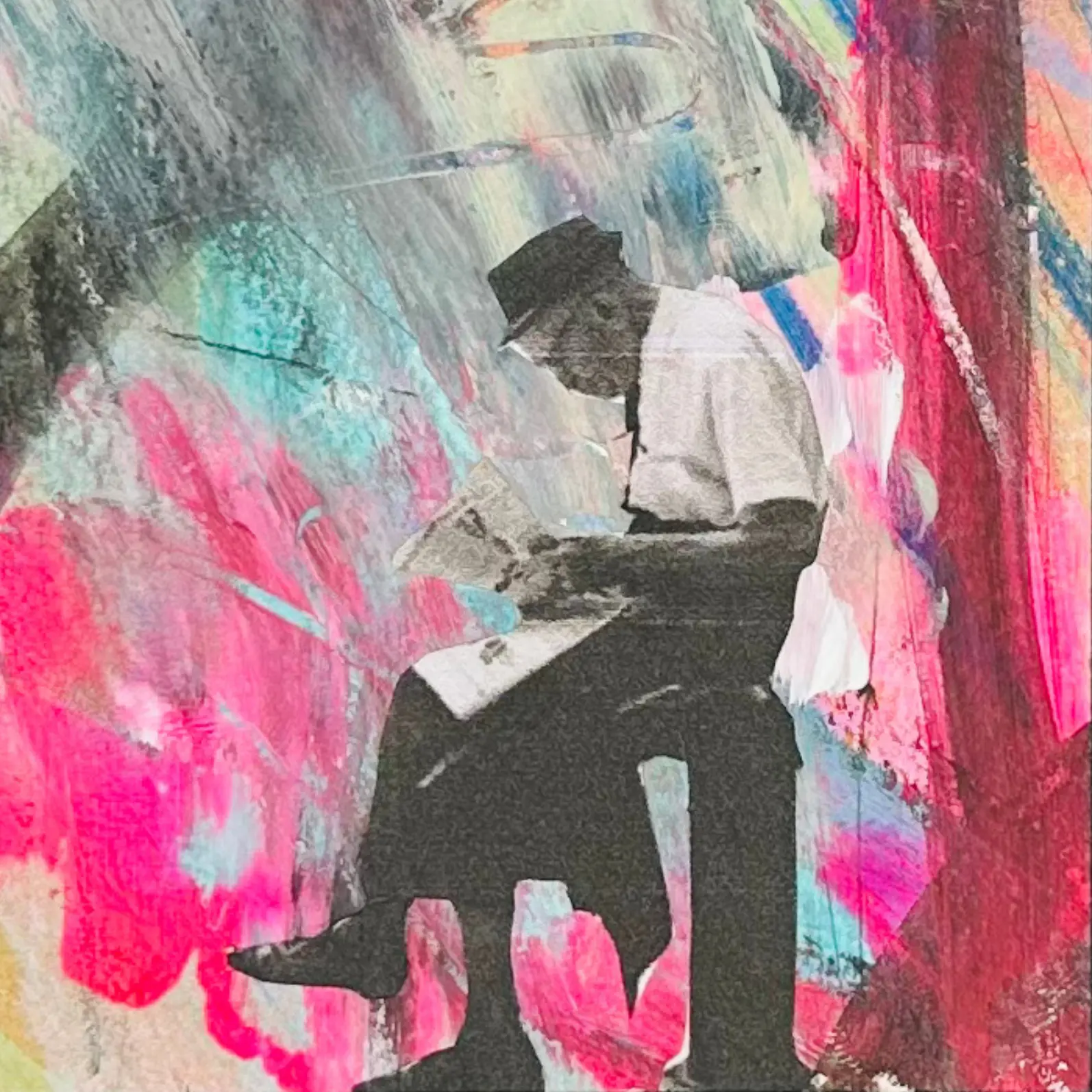 Puis, en observant ces fragments de couleurs, j’ai perçu comme des scènes, des échos du quotidien, des réminiscences d’histoires vécues ou rêvées. J’y ai invité des silhouettes en noir et blanc, venues d’un autre temps, pour leur offrir une place dans ces paysages intérieurs. Le contraste entre leurs contours figés et la vitalité des fonds colorés fait naître un dialogue : celui du réel et de l’imaginaire, du souvenir et de la trace encore vibrante.