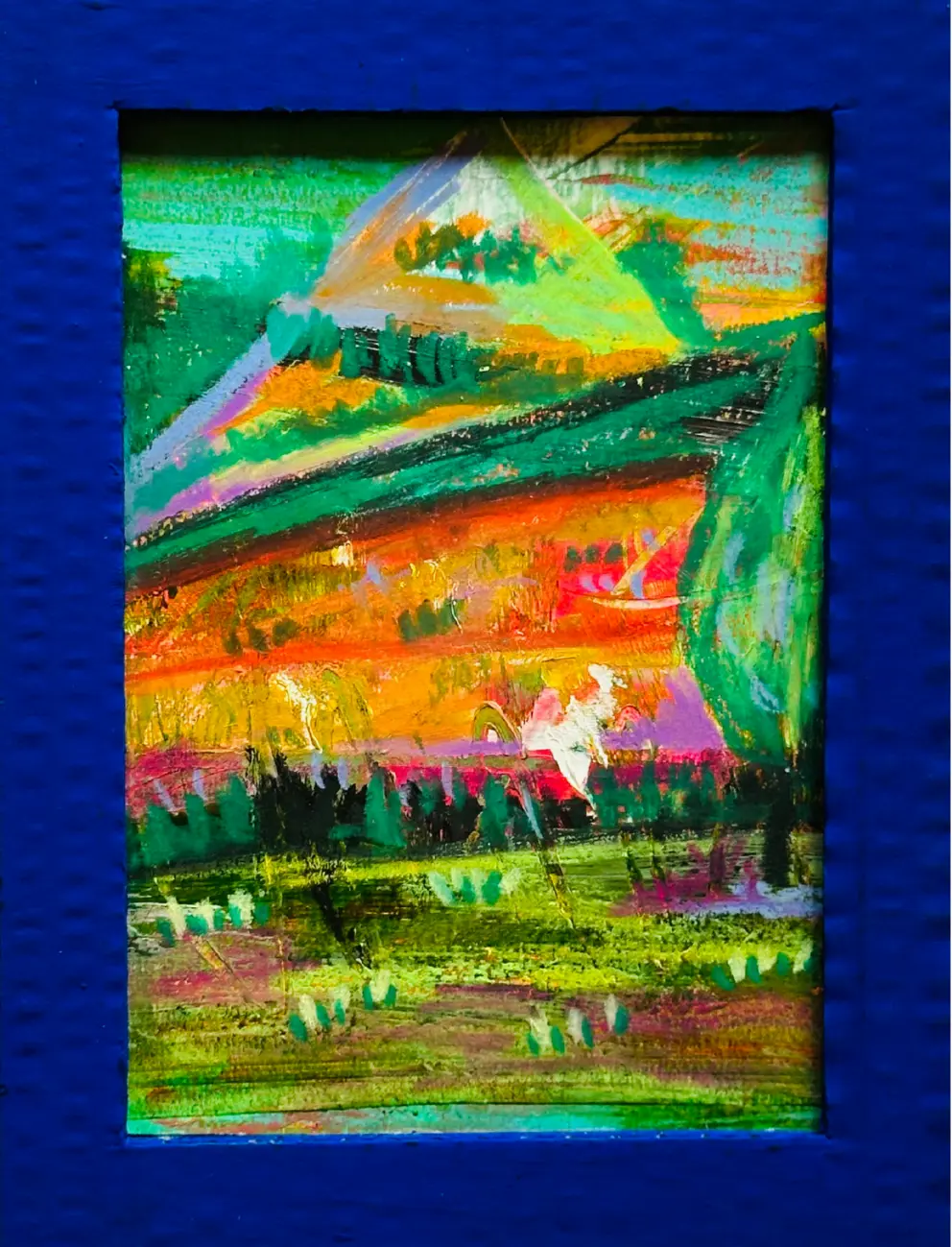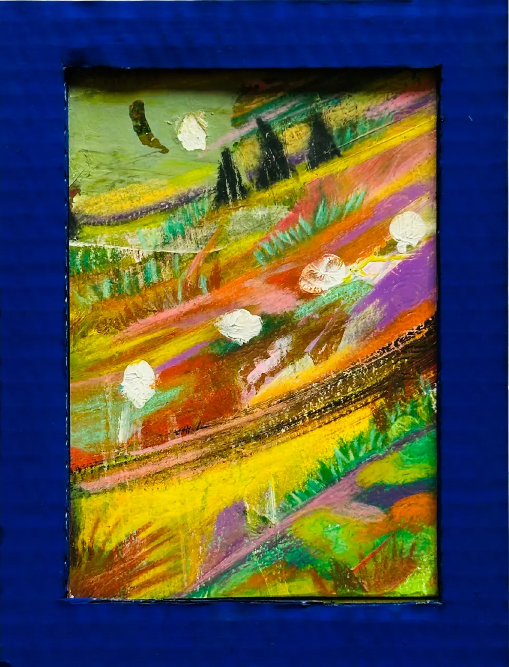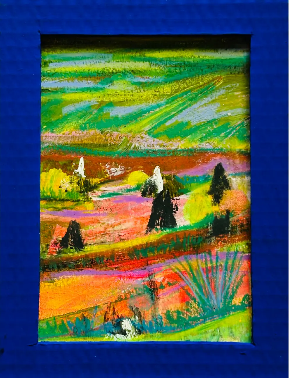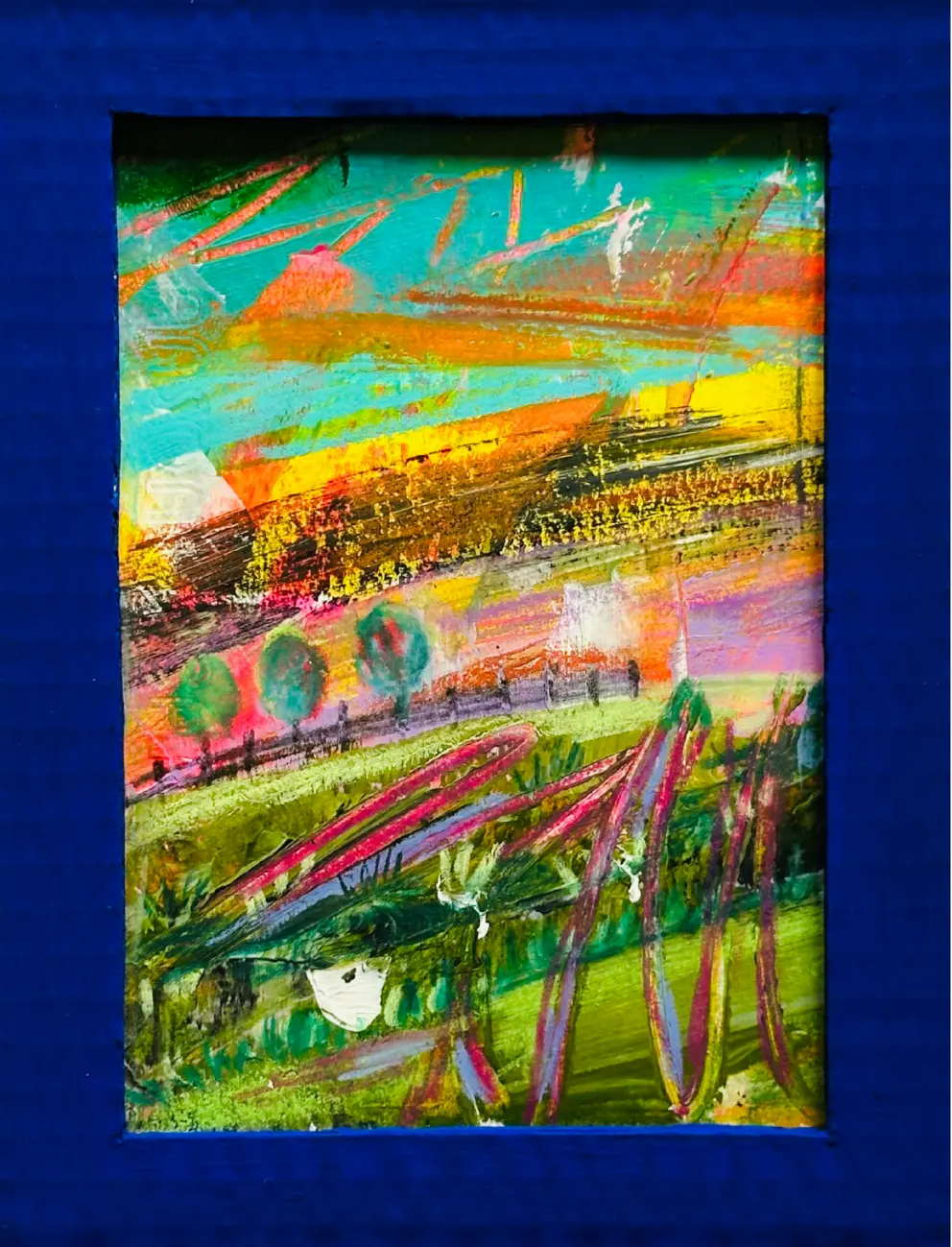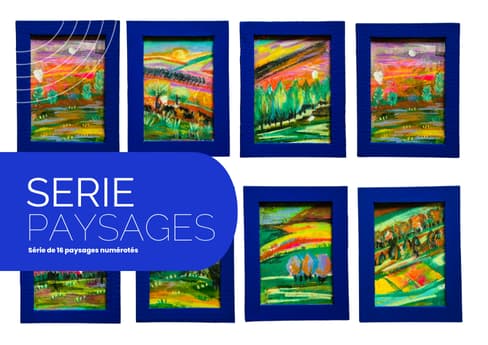 Une mini-série de douze œuvres originales, en petit format, où la couleur devient émotion et la matière, langage. Chaque tableau explore l’espace entre paysage réel et territoire intérieur à travers des techniques mixtes, des textures riches et des couleurs franches et vibrantes qui captent le regard et éveillent la sensibilité. Certaines compositions laissent apparaître des silhouettes de maisons ou des traces de nature recomposée, créant un dialogue subtil entre abstraction et mémoire du réel.
